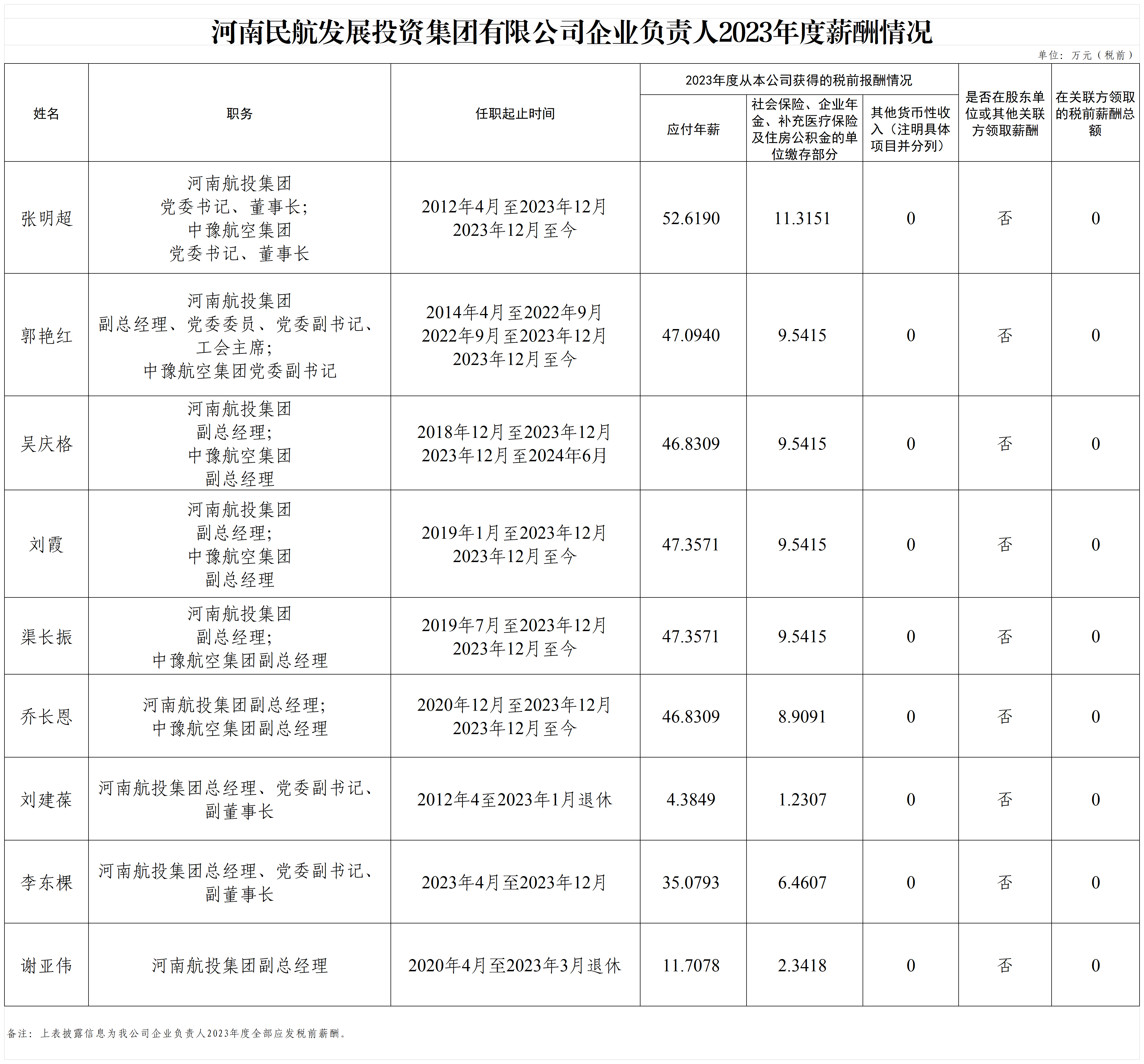 河南民航發(fā)展投資集團(tuán)有限公司企業(yè)負(fù)責(zé)人2023年度薪酬情況