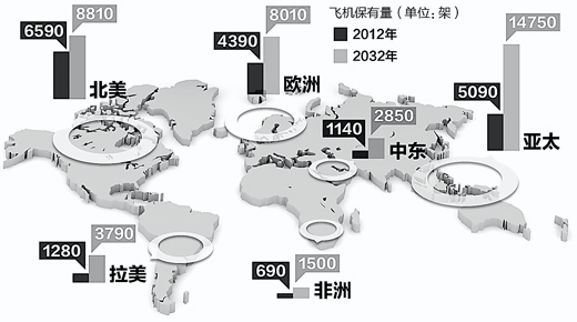 據(jù)《費(fèi)加羅報(bào)》報(bào)道,中產(chǎn)階層占全球人口比例將由2012年的30%上升至20年后的60%,其中亞太地區(qū)增長(zhǎng)尤其迅猛,中產(chǎn)階層人口將由2012年的7.46億上升至2031年的34億。而亞太地區(qū)正是航空市場(chǎng)發(fā)展最快的地區(qū)。
