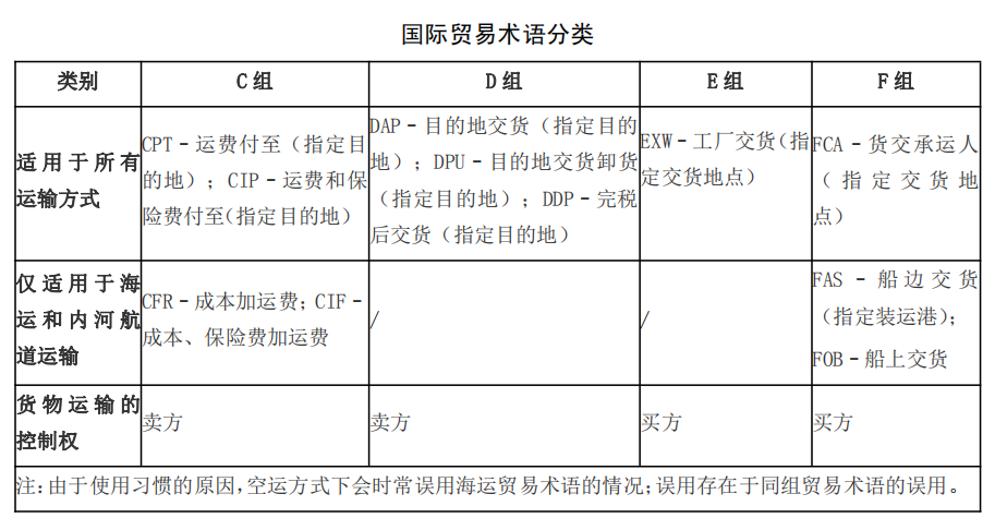 在國際貿(mào)易的貨物銷售合同中,進(jìn)出口商使用國際商會《國際貿(mào)易術(shù)語解釋通則》(Incoterms),界定買賣雙方在風(fēng)險(xiǎn)、成本、運(yùn)輸和保險(xiǎn)方面的義務(wù),避免誤解、爭議與因此導(dǎo)致的損失以及其他法律難題。根據(jù)最新的《國際貿(mào)易術(shù)語解釋通則》2020版,國際貿(mào)易術(shù)語共分成2類4組11個(gè)。